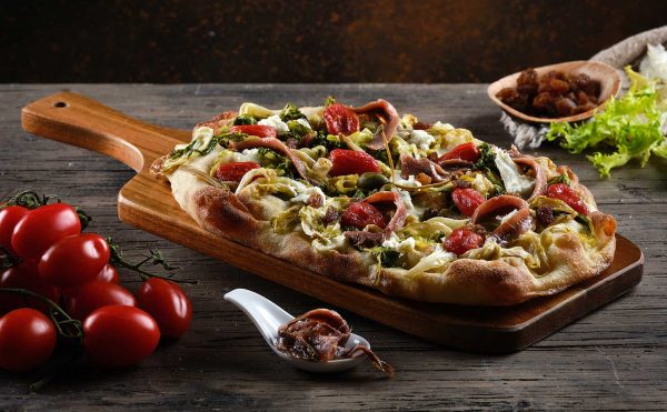 Once out of the oven, finish with anchovy fillets, caper berries, soaked raisins, and a drizzle of extra virgin olive oil.